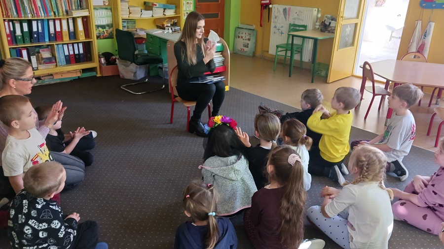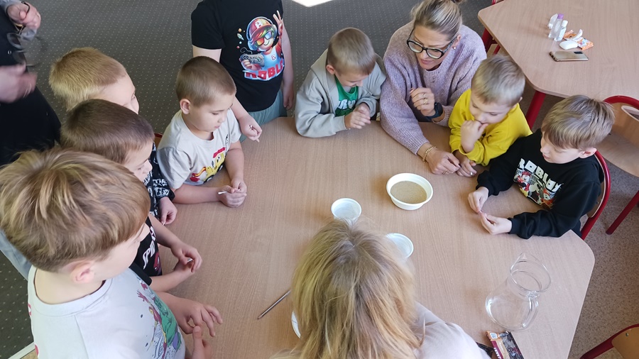 31.10.25 odbyło się spotkanie z paniami z Sanepidu pod hasłem „6 skoków do naprawdę czystych rąk”. Celem spotkania było uwrażliwienie dzieci na konieczność mycia rąk oraz poznanie zasady działania mydła na brudne ręce. Był wiersz, zabawa paluszkowa oraz doświadczenia z pieprzem, wodą i mydłem.
