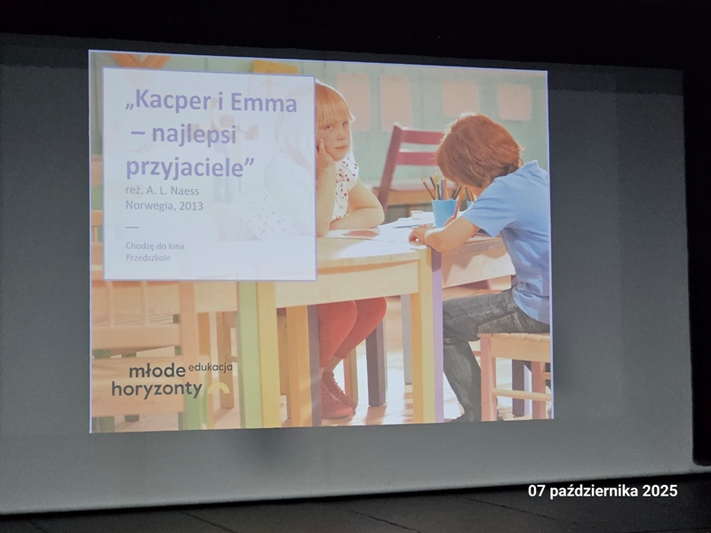 7 października trzy grupy wybrały się do kina na seans pt. „Kacper i Emma – najlepsi przyjaciele”. Film opowiadał o lęku przed tym, co nowe, o strachu, nad którym trudno zapanować, o wielkiej sile prawdziwej przyjaźni oraz o tym, że zmiana miejsca zamieszkania i związane z tym przeniesienie do nowego przedszkola to dla małego dziecka trudna sytuacja. Zapraszamy na relację z tego wydarzenia: https://www.youtube.com/shorts/NRI_YYvdIjI