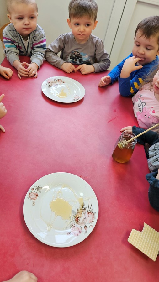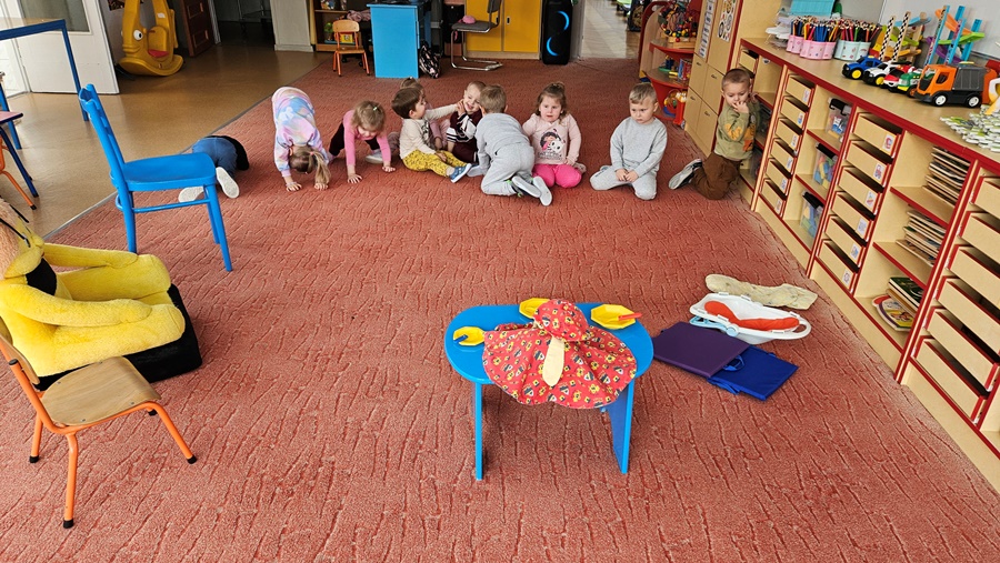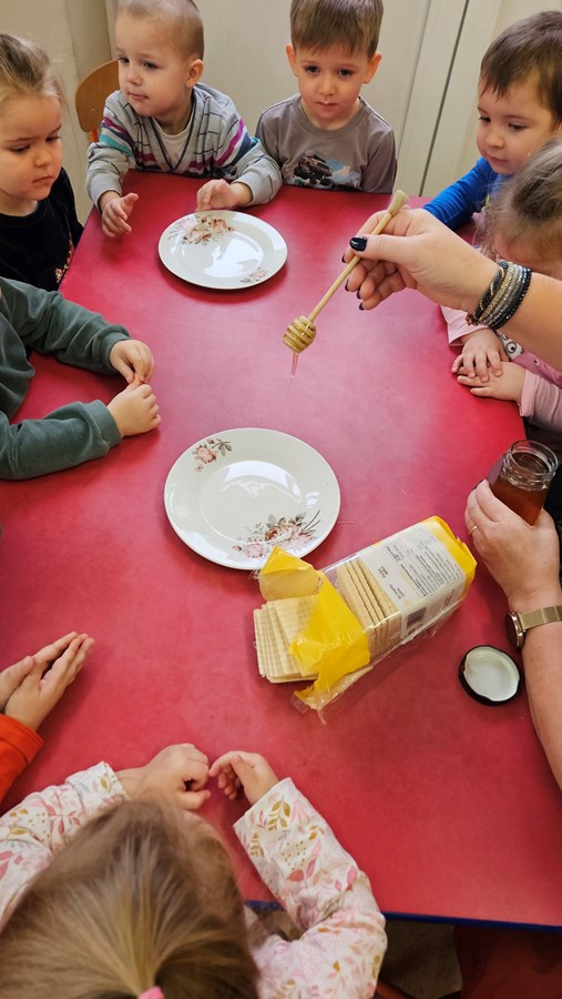 Z pszczołą Genowefą poznawaliśmy określenia dużo-mało, duży-mały, wysoko-nisko oraz uczyliśmy się w zabawie części naszego ciała. Genowefa towarzyszyła nam podczas zajęć, przedstawiła nam swoich przyjaciół i uczyła nas grzeczności.