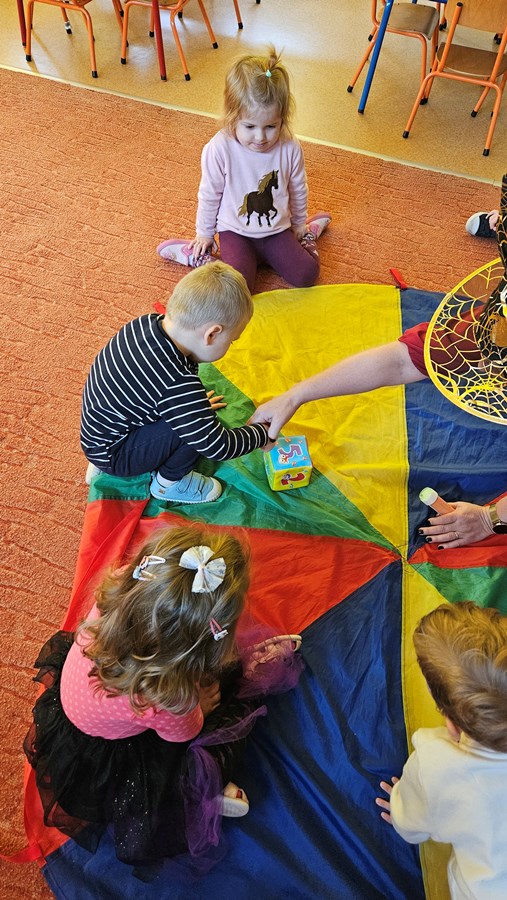 15.09.22. Maluszki obchodziły po raz pierwszy Dzień Kropki. Pani Kropka przyniosła im do zabawy różne kolorowe kropki: duże, małe i jedną ogromną, którą trzymały wszystkie dzieci. Były wesołe zabawy z chustą, układanie z wyciętych kropek, próby rysowania kropek oraz dobieranie kolorów.
