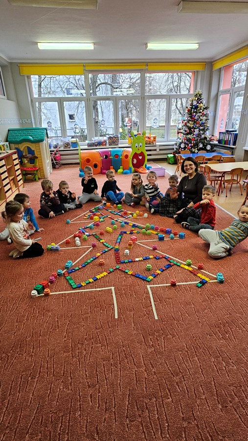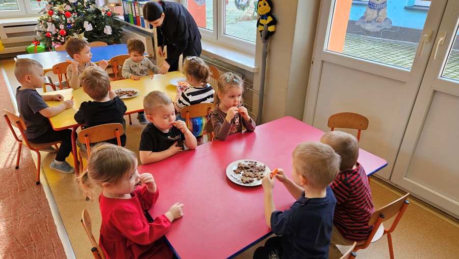21 grudnia dzieci odświętnie ubrane wzięły udział w spotkaniu opłatkowym z dziećmi wszystkich grup i personelu przedszkola. Następnie zasiadły do wigilijnego obiadu.