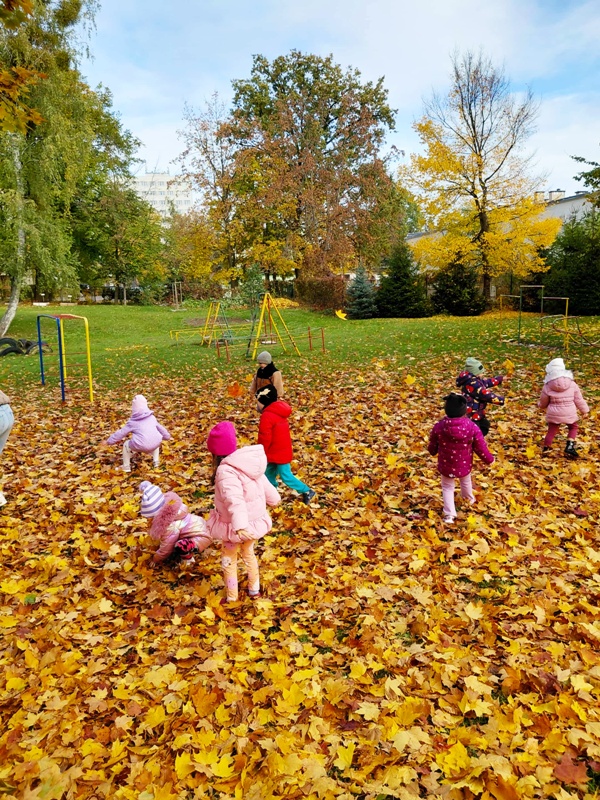 23 września ” Krasnalki ” powitały nową porę roku – Jesień. Z tej okazji dzieci uczestniczyły w różnorodnych, tematycznych zabawach, które pozwoliły im poczuć wyjątkowy klimat jesieni. Odkrywaliśmy jesienne obrazki ukryte na liściach, wykorzystując latarkę. Dużą radość sprawiła dzieciom zabawa ze spinaczami, podczas której ćwiczyły spostrzegawczość i koordynację wzrokowo – ruchową. W ramach aktywności plastycznej przedszkolaki ozdabiały suknię Pani Jesieni kolorowymi liśćmi. A na zakończenie dnia wybraliśmy się do ogrodu przedszkolnego by pobiegać po szeleszczących jesiennych liściach. Jesienne zabawy dostarczyły wszystkim wiele uśmiechu i niezapomnianych wrażeń
