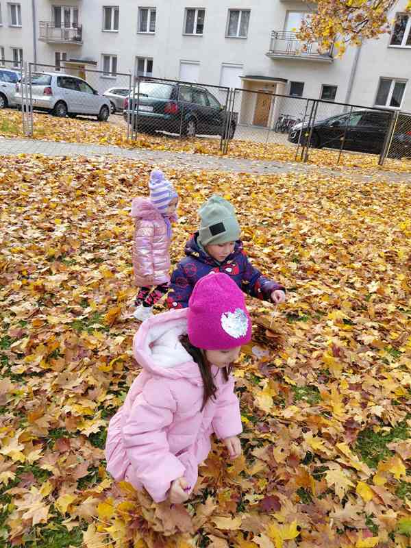 Korzystając z pięknej, jesiennej pogody, Krasnale wybrały się do ogrodu przedszkolnego. Wspólnie obserwowaliśmy zmiany zachodzące w przyrodzie oraz spadające liście. Dzieci bawiły się nimi- podrzucały je do góry i robiły ,,liściowe konfetti”. Najwięcej radości sprawiło dzieciom wykonanie z zbieranych liści „Gąsieniczek Liściaków”. Zajęcia na świeżym powietrzu dostarczyły przedszkolakom wielu wrażeń, radości i okazji do wspólnej zabawy.