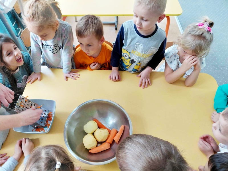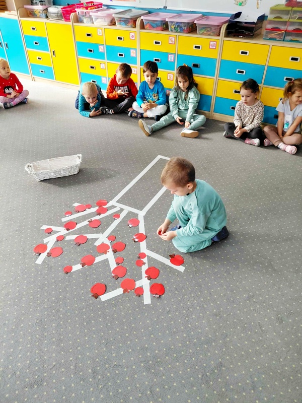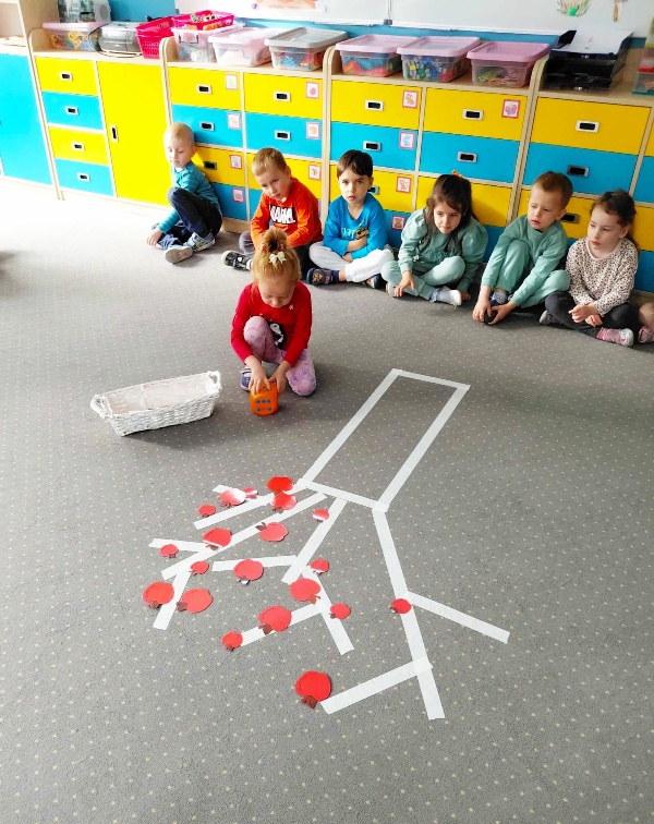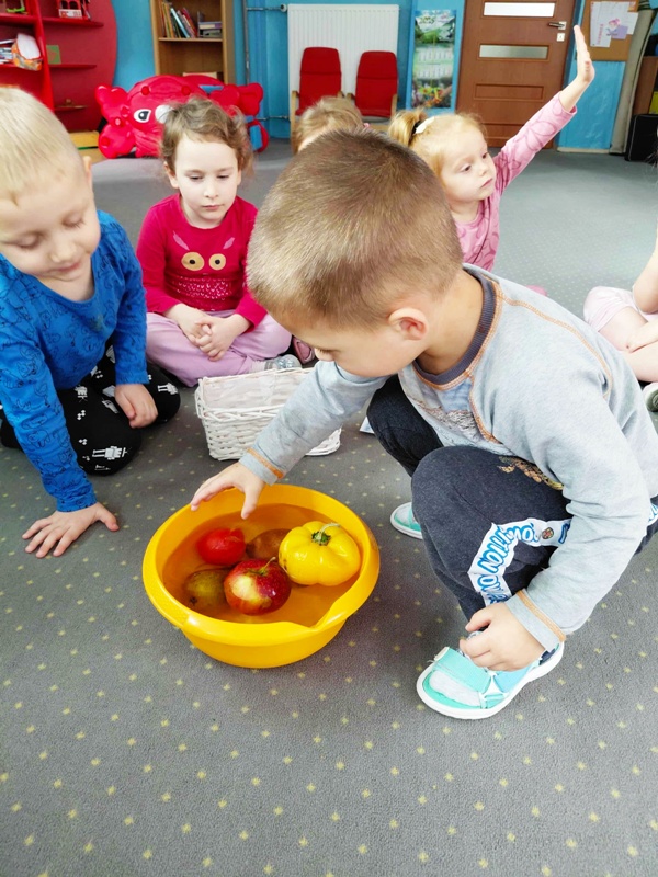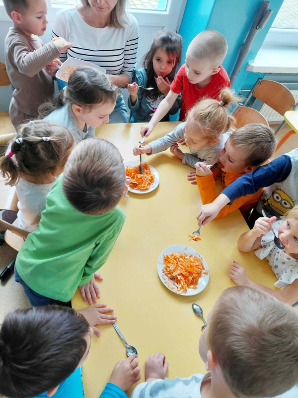 Tego dnia dzieci wzięły udział w zabawie matematyczno- ruchowej ” W sadzie”, podczas której ” zrywały” jabłka zgodnie z liczbą kropek wyrzuconych na kostce. Następnie obejrzały teatrzyk inspirowany wierszem J. Brzechwy ,,Na straganie”. Na zakończenie zajęć wspólnie degustowaliśmy pyszną i zdrową surówkę z marchewki i jabłka . To był dzień pełen zabawy, smaku, zapachu i zdrowia