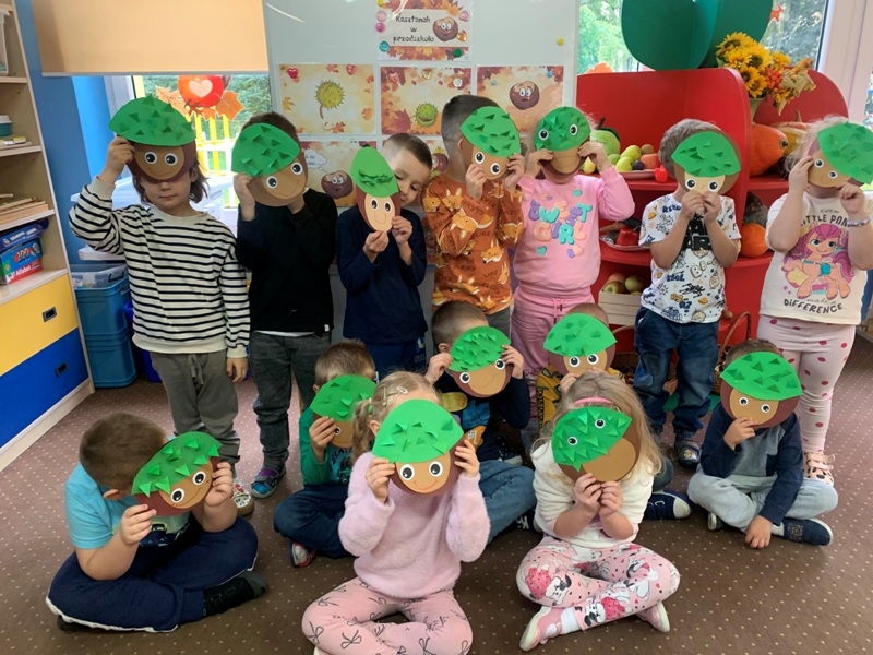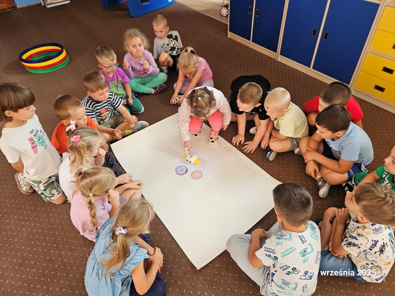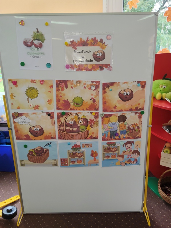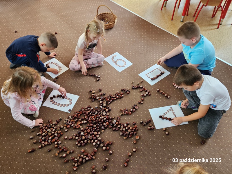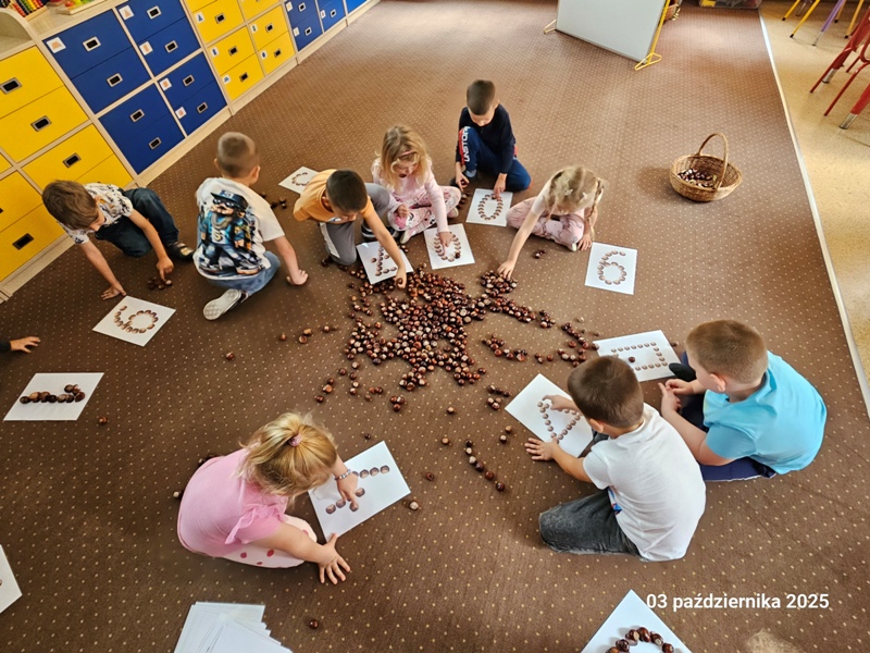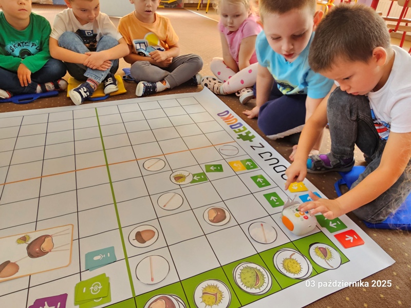 Jesienne zabawy z kasztanami w roli głównej sprawiły dzieciom ogromną radość. Muchomorki wysłuchały krótkiego opowiadania o kasztanku, rozwijały swoją sprawność fizyczną oraz manualną. Zwieńczeniem tego dnia było układanie wzorów z kasztanów oraz programowanie robota Zosi w ramach projektu „Zakodowana Kraina Przygód Zosi”.