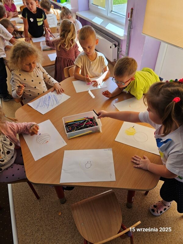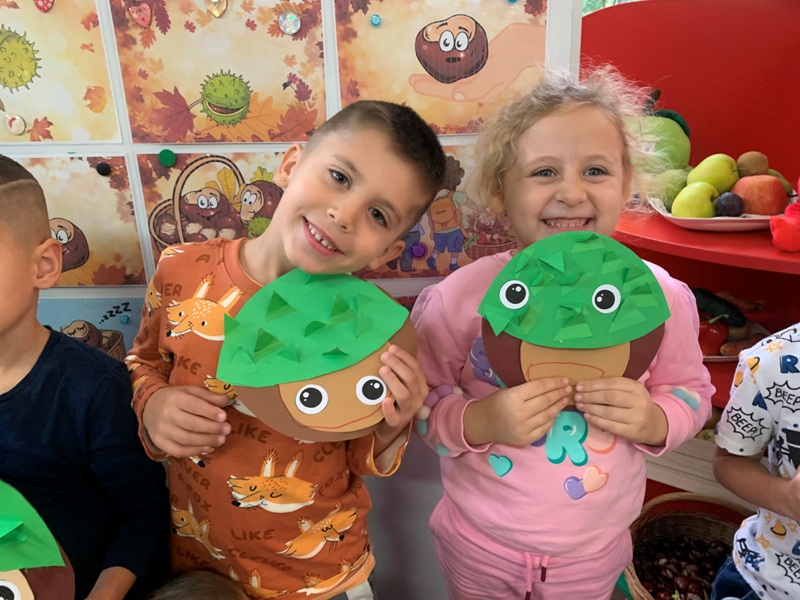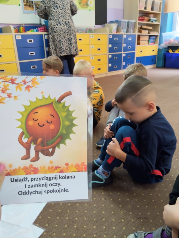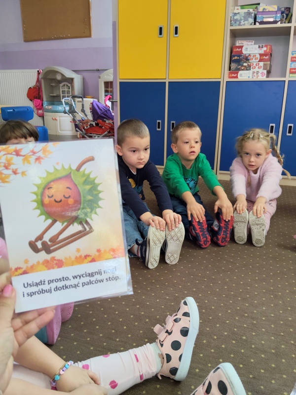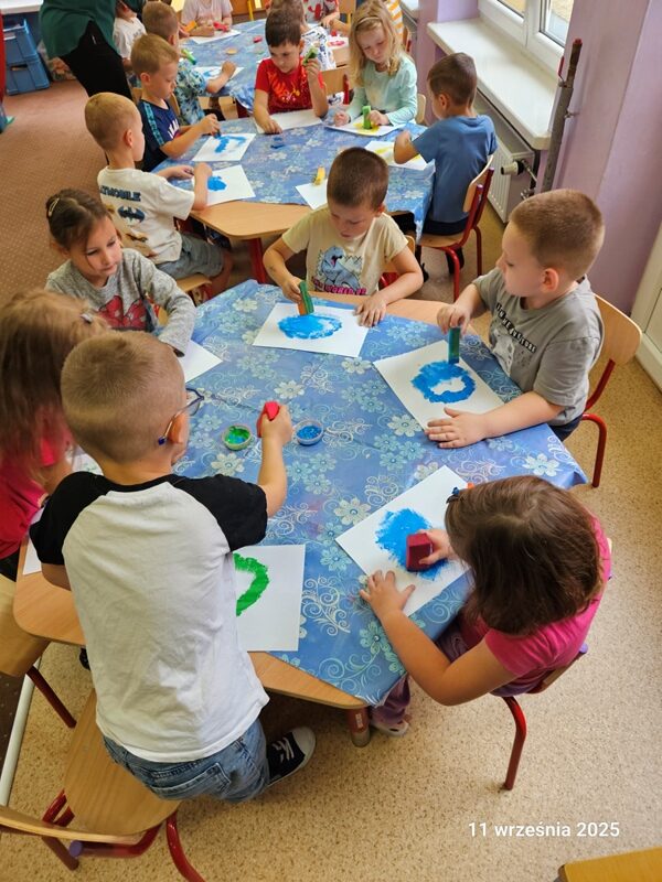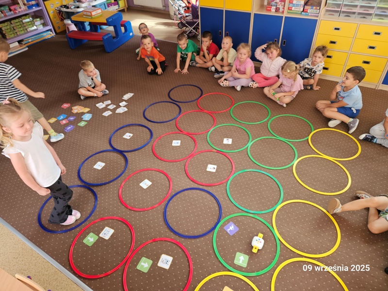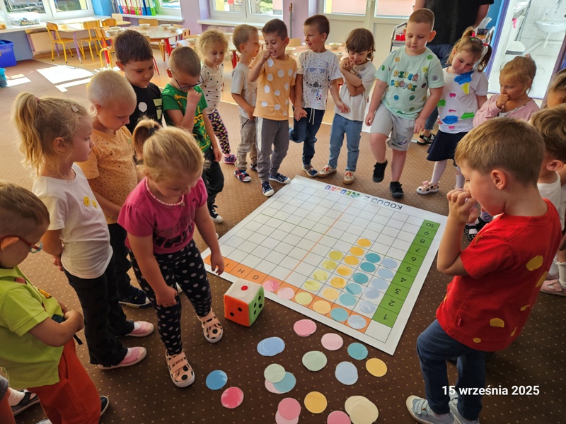 Jesienne zabawy z kasztanami w roli głównej sprawiły dzieciom ogromną radość. Muchomorki wysłuchały krótkiego opowiadania o kasztanku, rozwijały swoją sprawność fizyczną oraz manualną. Zwieńczeniem tego dnia było układanie wzorów z kasztanów oraz programowanie robota Zosi w ramach projektu „Zakodowana Kraina Przygód Zosi”.