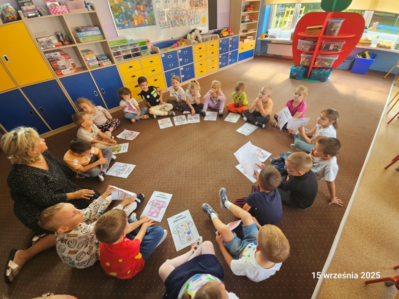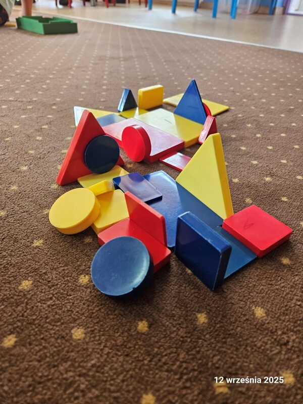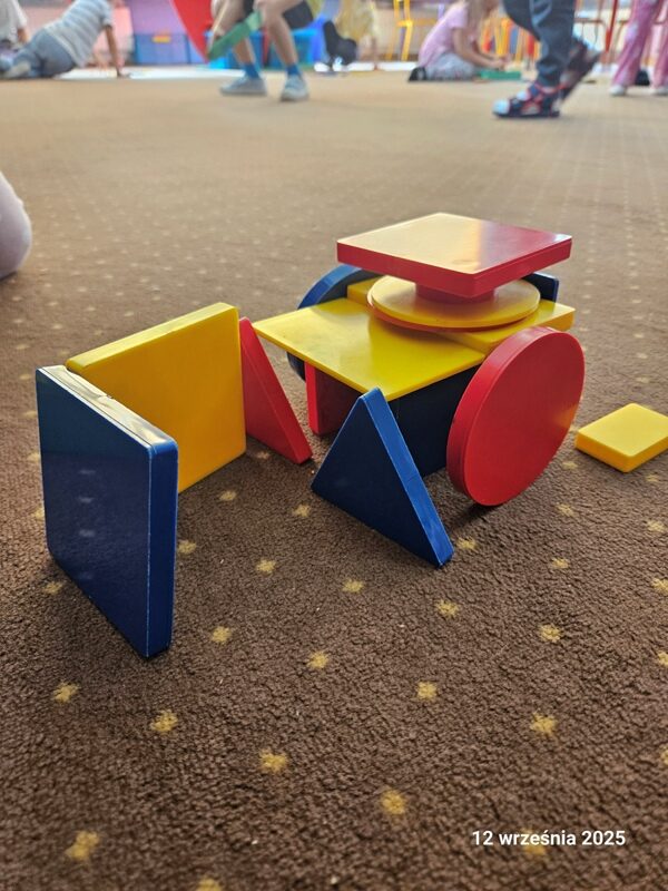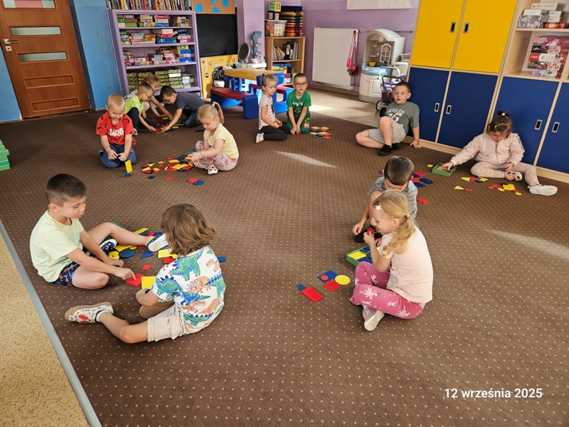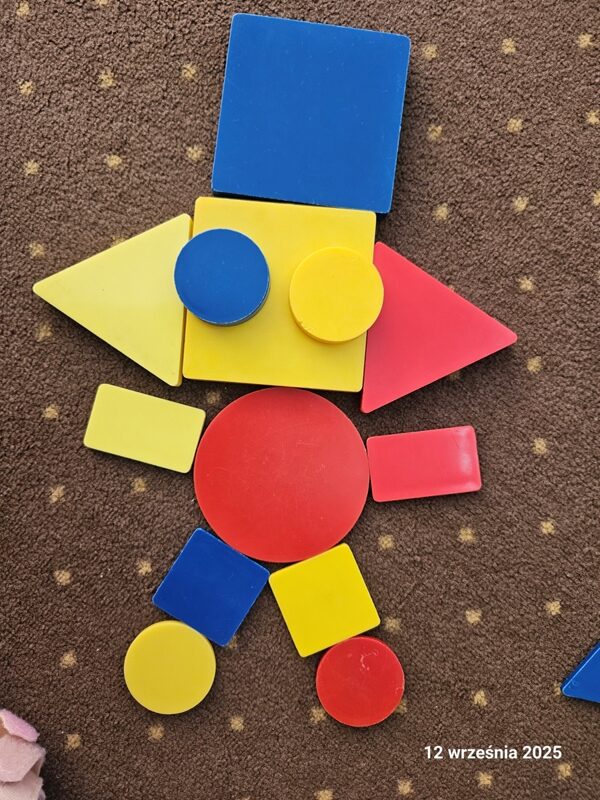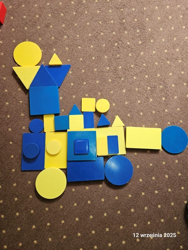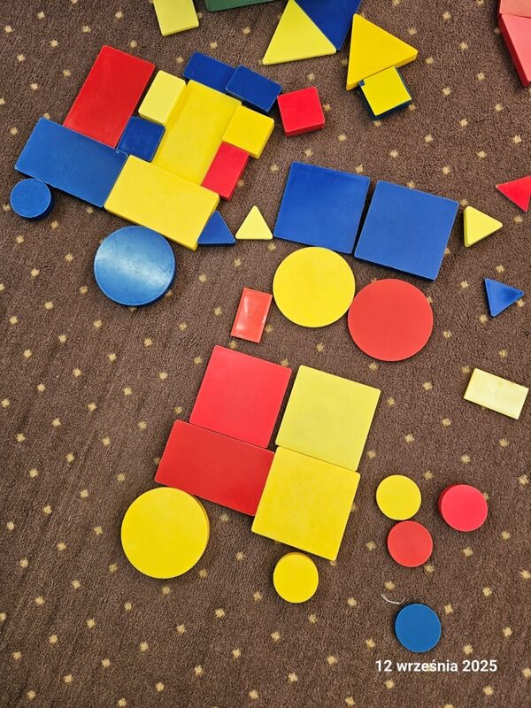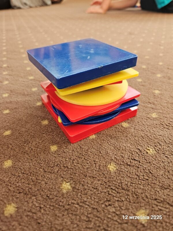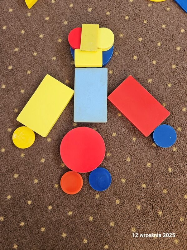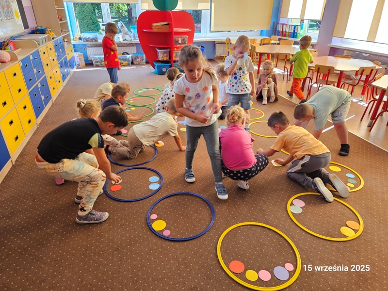 W tym dniu dzieci bawiły się kropkami. Była ścieżka zdrowia z kropek, układanie kropek z części, zabawy zręcznościowe podczas podawania spinaczami kropek i komponowanie kubistycznych form wokół kropki.