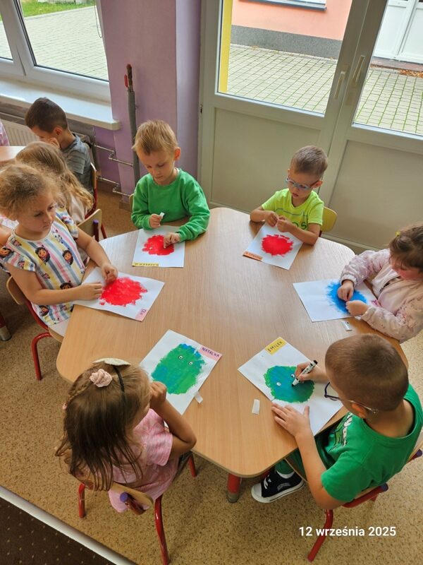 W listopadzie dzieci bawiły się kolorem. Obserwowały wędrującą kolorową wodę, mieszały kolory, dmuchały kolorowe bańki i rozcierał plastelinę.