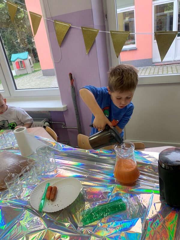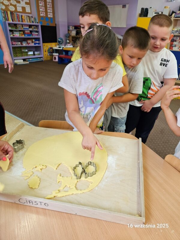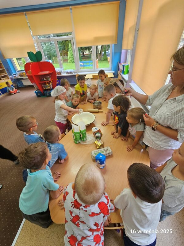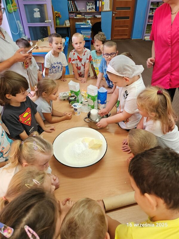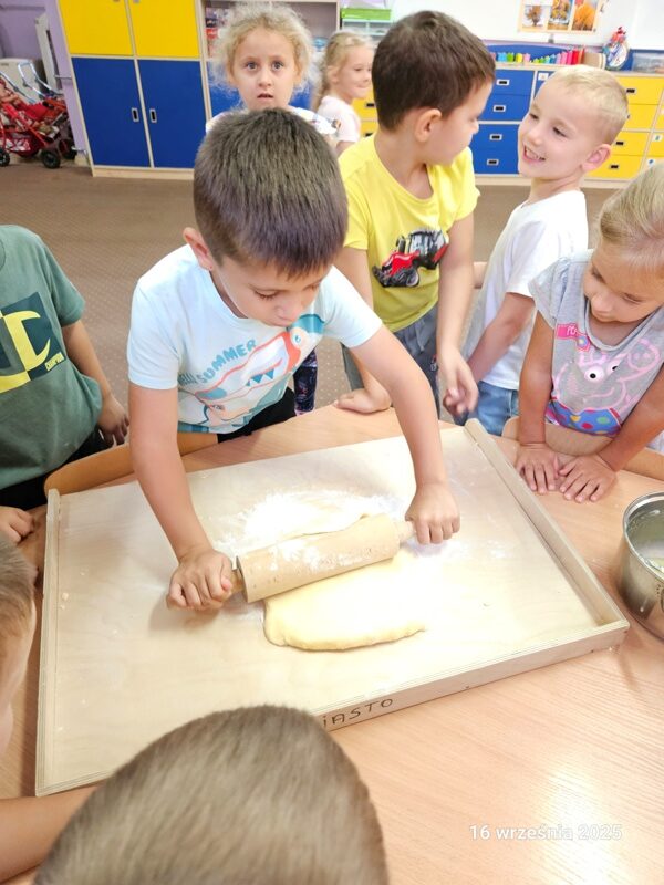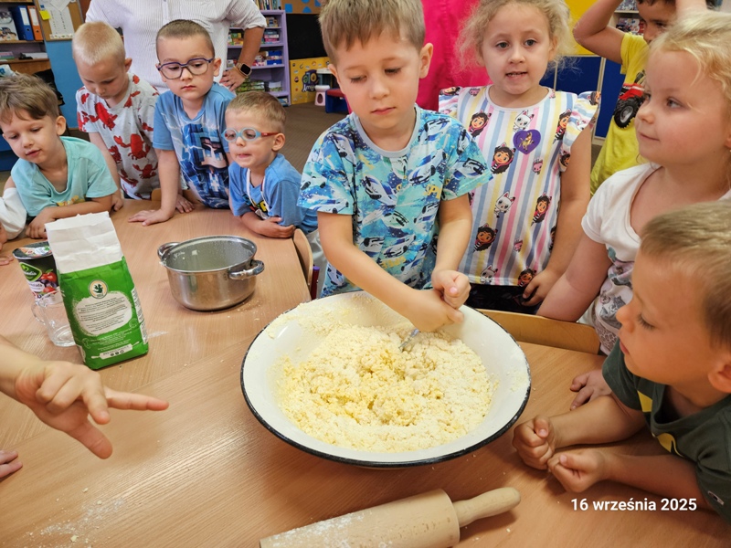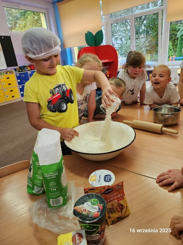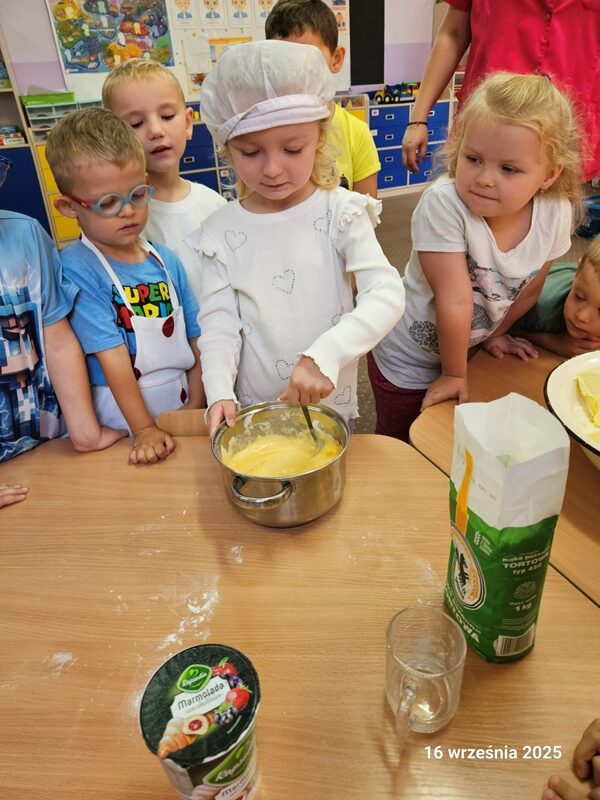 Z okazji Dnia Przedszkolaka Muchomorki zamieniły się w prawdziwych cukierników! Wspólnie przygotowały produkty oraz zagniatały ciasto. Zajęcia kulinarne stały się okazją do rozwijania współpracy, ćwiczenia sprawności manualnej oraz utrwalania zasad higieny. Największą radość sprawiła dzieciom degustacja wypieków oraz możliwość podzielenia się ciasteczkami z przechodniami podczas uroczystego pochodu.