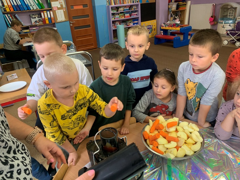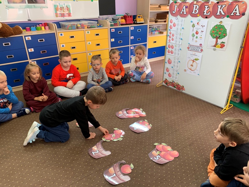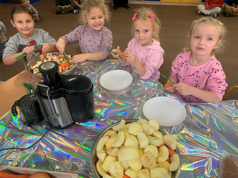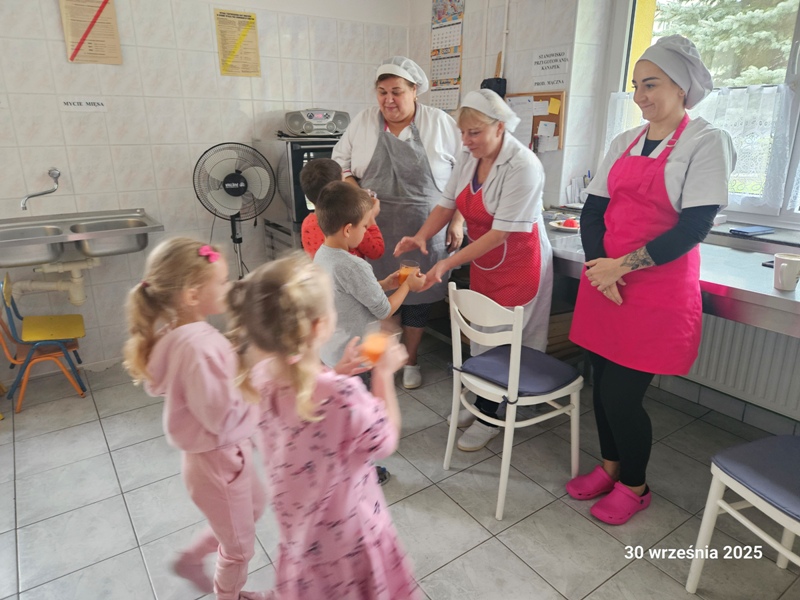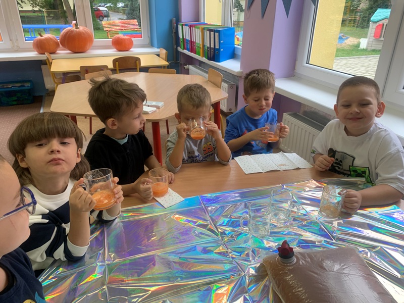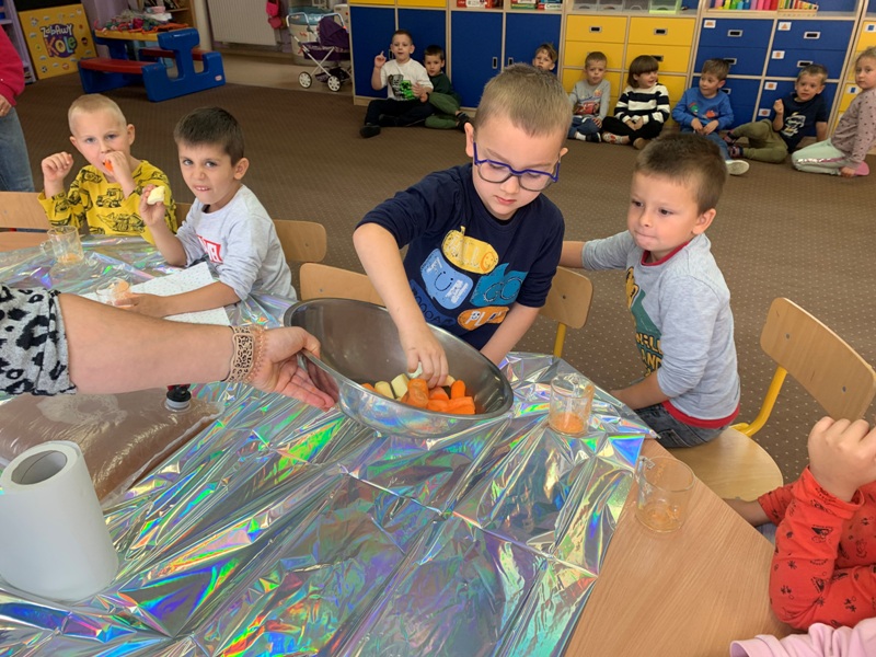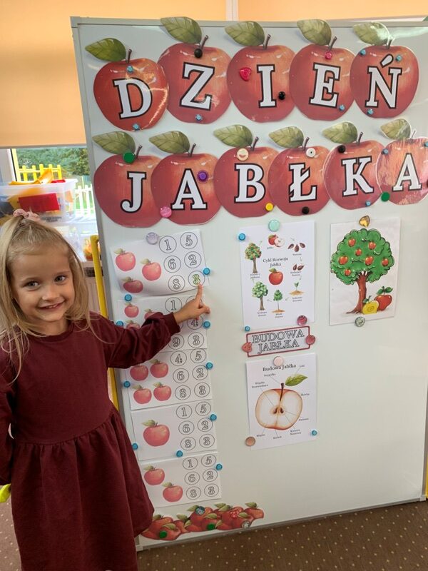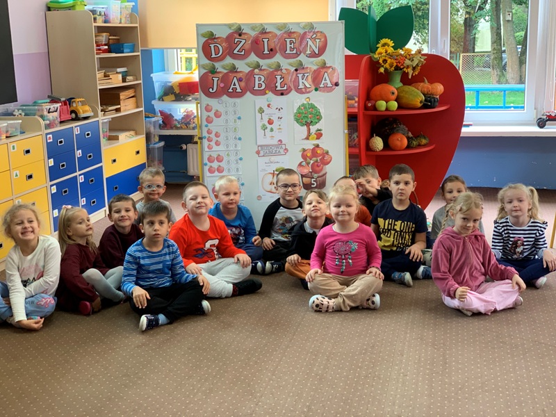 Muchomorki świętując Dzień Jabłka poznały różne odmiany jabłek, ich kolory i smak. Dzieci dowiedziały się o walorach zdrowotnych jabłek, ich wpływie na odporność i trawienie oraz o tym, jak ważne są w codziennej diecie. Zwieńczeniem tego święta było wspólne przygotowanie soku z pysznych, soczystych jabłek.