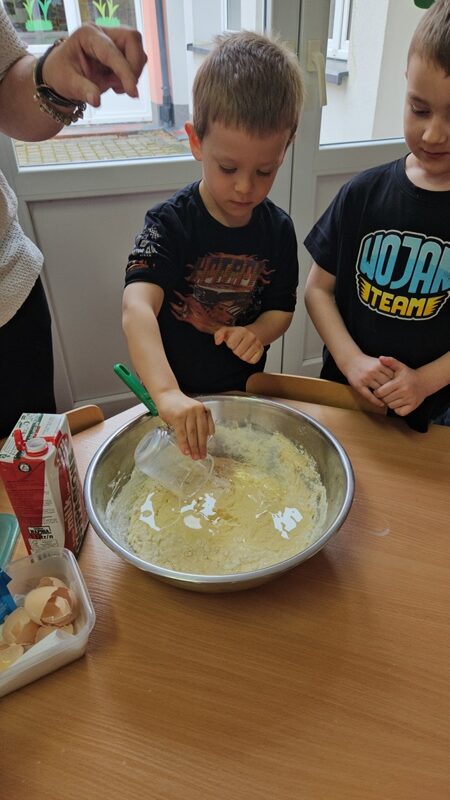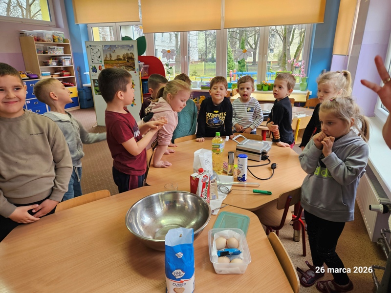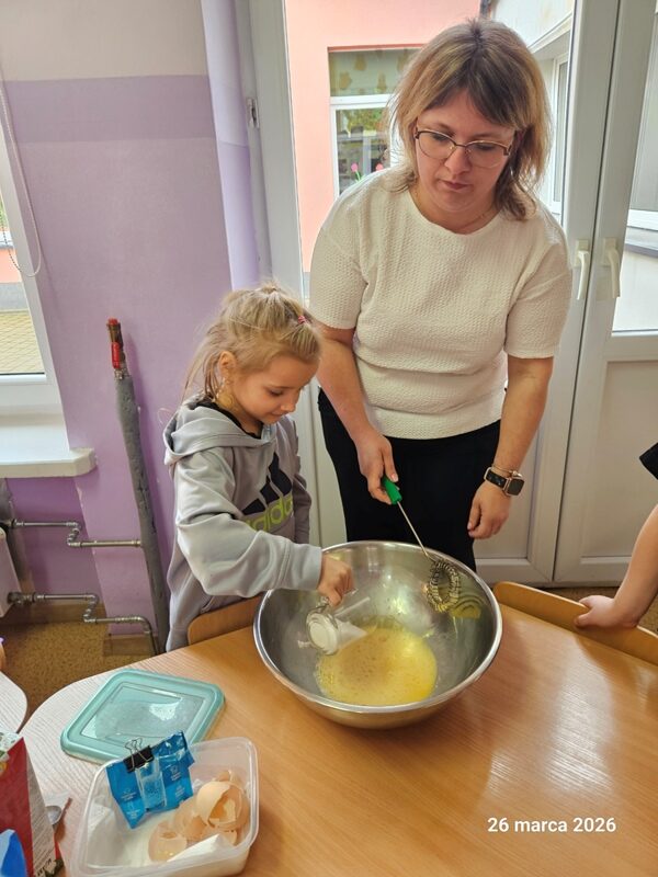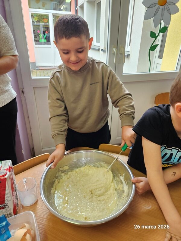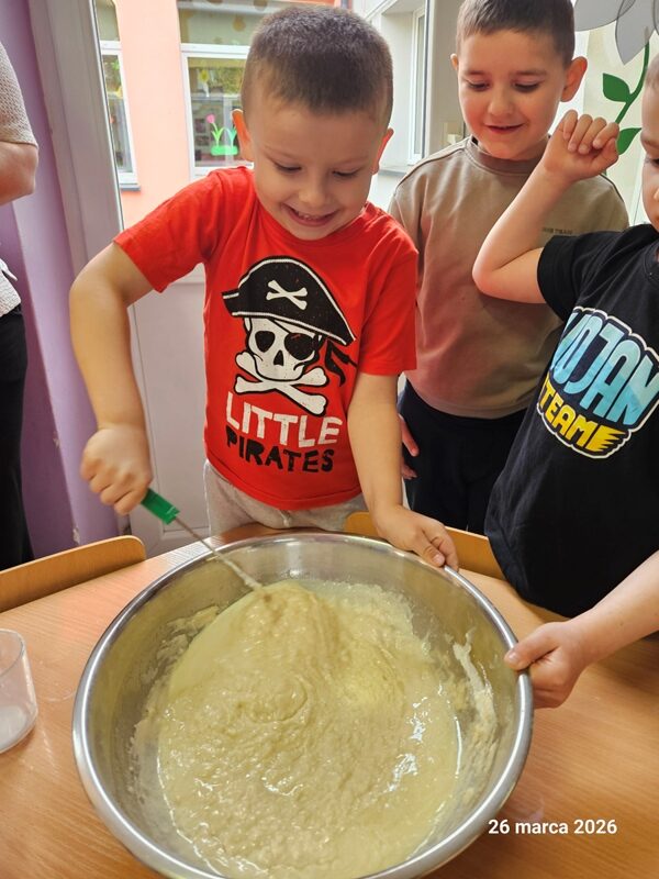 Z okazji Dnia Przedszkolaka Muchomorki zamieniły się w prawdziwych cukierników! Wspólnie przygotowały produkty oraz zagniatały ciasto. Zajęcia kulinarne stały się okazją do rozwijania współpracy, ćwiczenia sprawności manualnej oraz utrwalania zasad higieny. Największą radość sprawiła dzieciom degustacja wypieków oraz możliwość podzielenia się ciasteczkami z przechodniami podczas uroczystego pochodu.