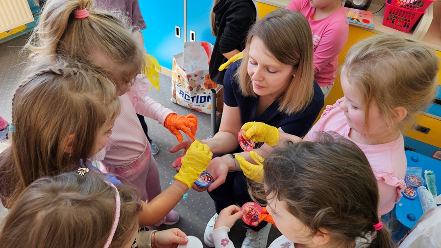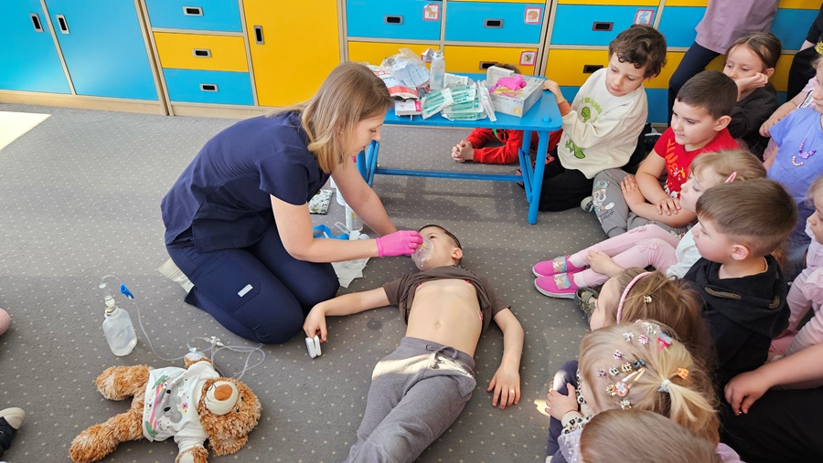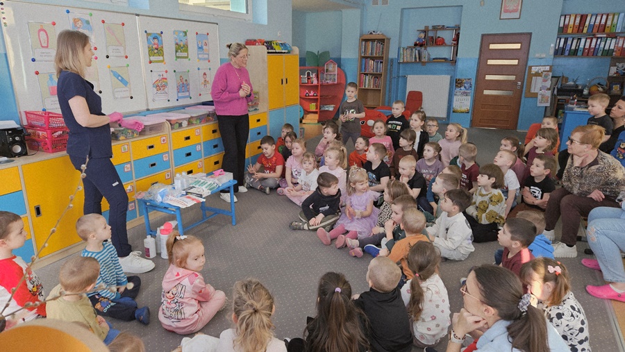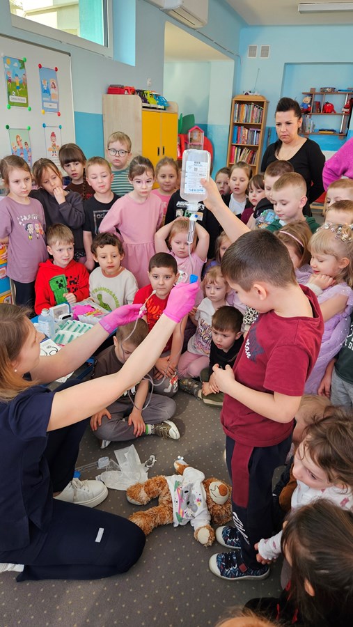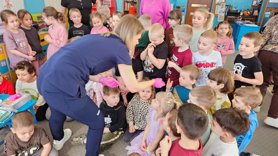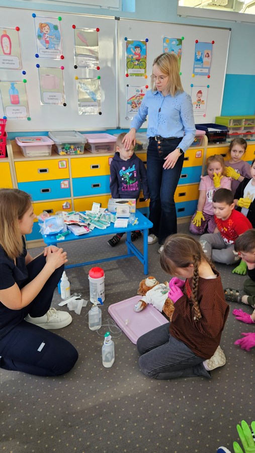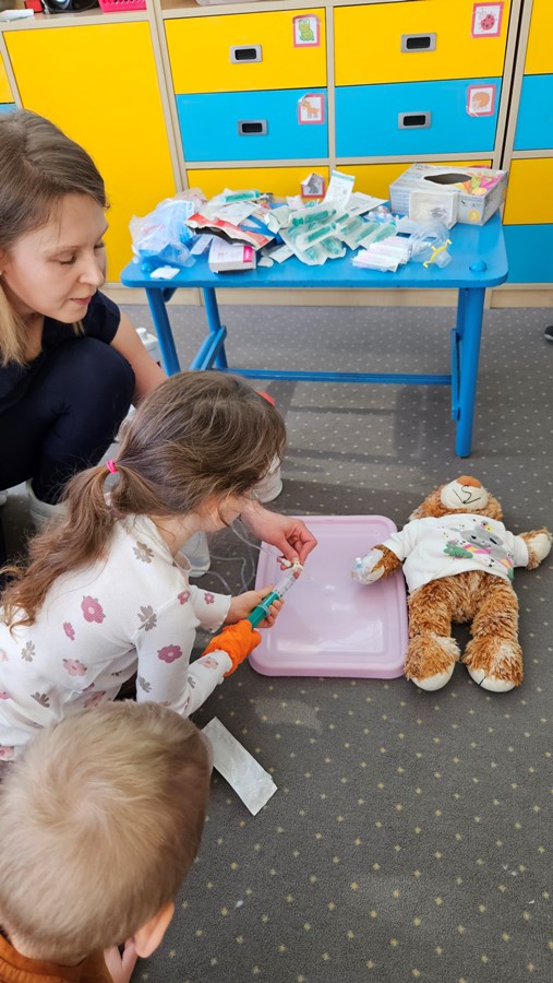 11 marca gościliśmy w naszym przedszkolu panią pielęgniarkę Ewelinę Żytko. Nasz gość profesjonalnie zapoznał dzieci z procedurami wykonywanymi podczas przyjmowania dziecka do szpitala. W tym zadaniu bardzo pomocny okazał się miś, na którym pani Ewelina demonstrowała różne czynności. Spotkanie miało charakter warsztatowy, dzieci z zainteresowaniem i zaangażowaniem uczestniczyły w zajęciach i chętnie wcielały się w rolę pielęgniarki.