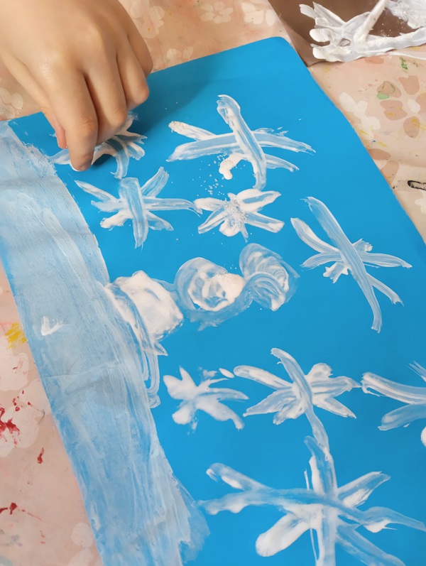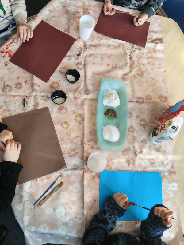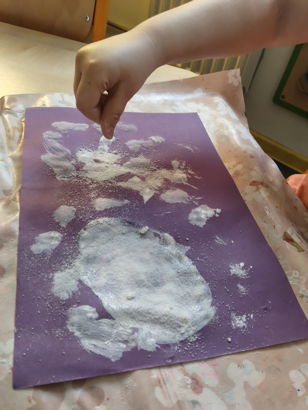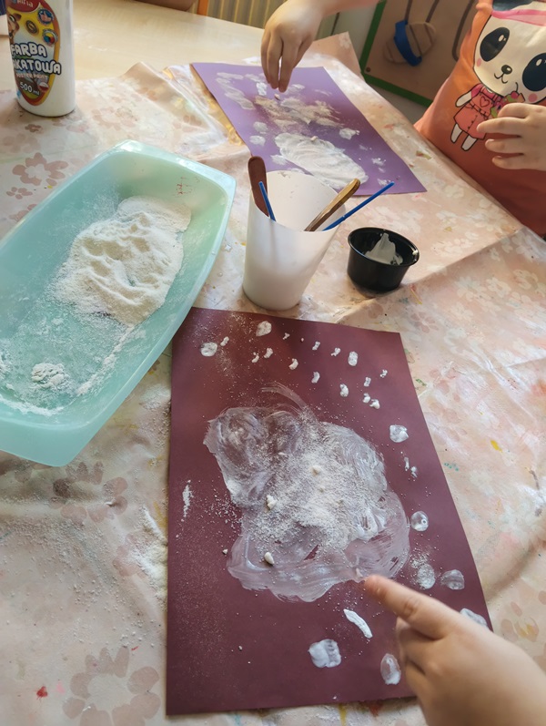 Na zajęciach terapeutycznych i rewalidacyjnych dzieci wykonały kolejne zadanie w ramach Ogólnopolskiego Projektu Edukacyjny Rok Dziecięcej Kreatywności. Tematem pracy plastycznej był zimowy pejzaż. Wykorzystując farby, płatki kosmetyczne,sól, mąkę, przy dźwiękach muzyki Vivaldiego dzieci z pomocą różnych zmysłów kreatywnie i z radością tworzyły pokryte śniegiem obrazy.